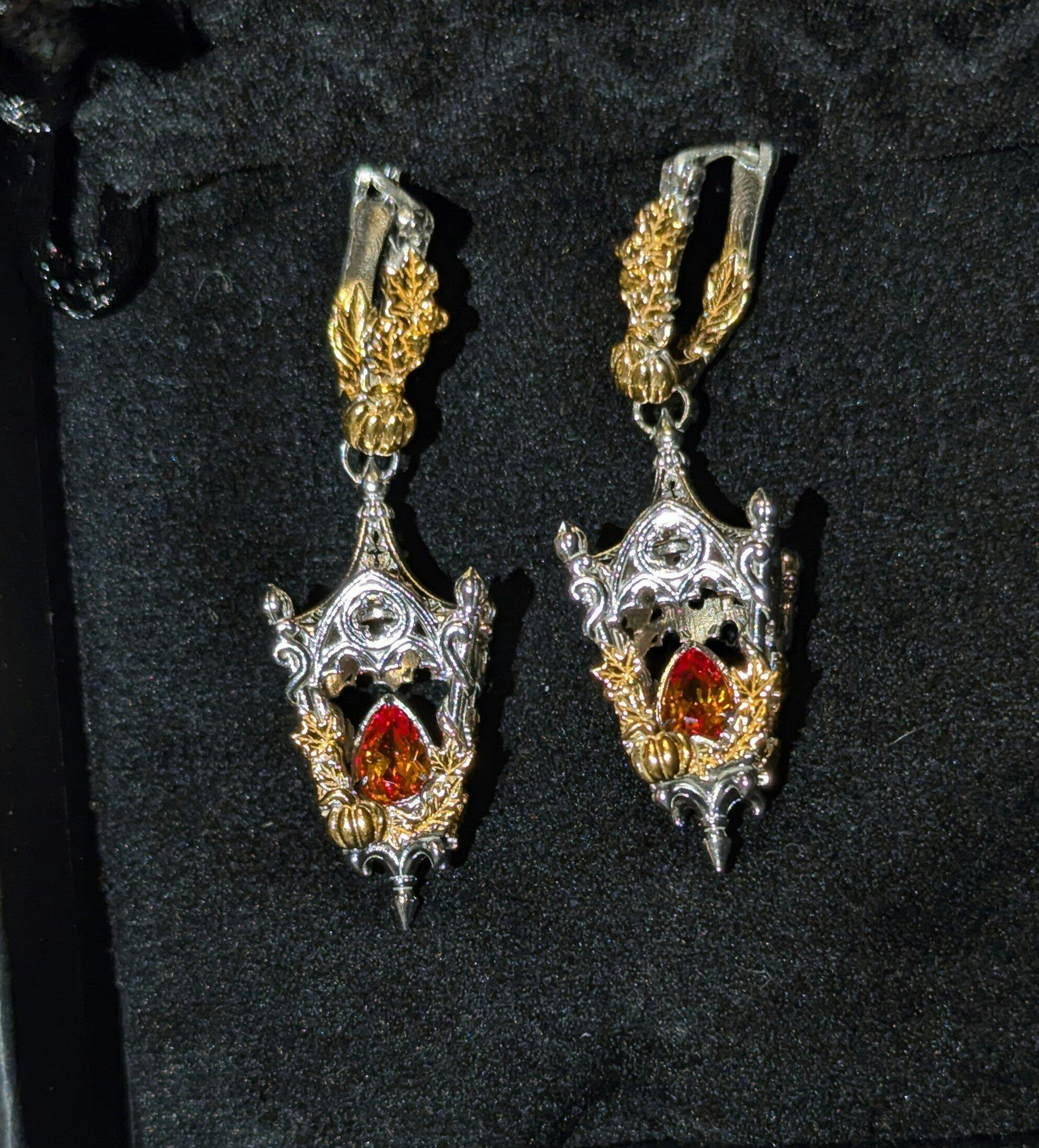 I absolutely feel in love with the elongated V lantern earrings from the first moment I saw them, so when I saw these, I knew I had to get them for my collection. I got the silver with gold yellow gold pumpkins and leave with a lab grown orange sapphire and it is so perfect. They really add such elegance to any outfit. I would definitely recommend them to a yone looking for fall themed earrings to add elegance or whimsy to their outfits. I adore showing them off, and people love them! I feel like I notice a new detail every time I put them on. Plus, they're so comfortable to wear! They really are lighter, and sturdier, than they look.