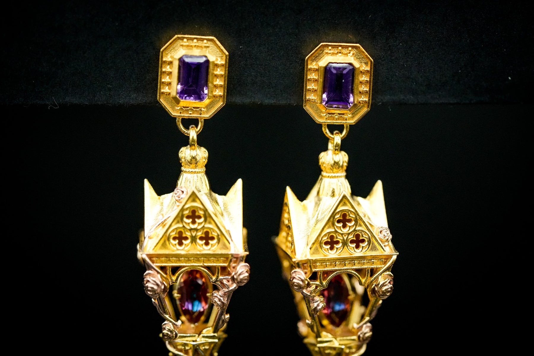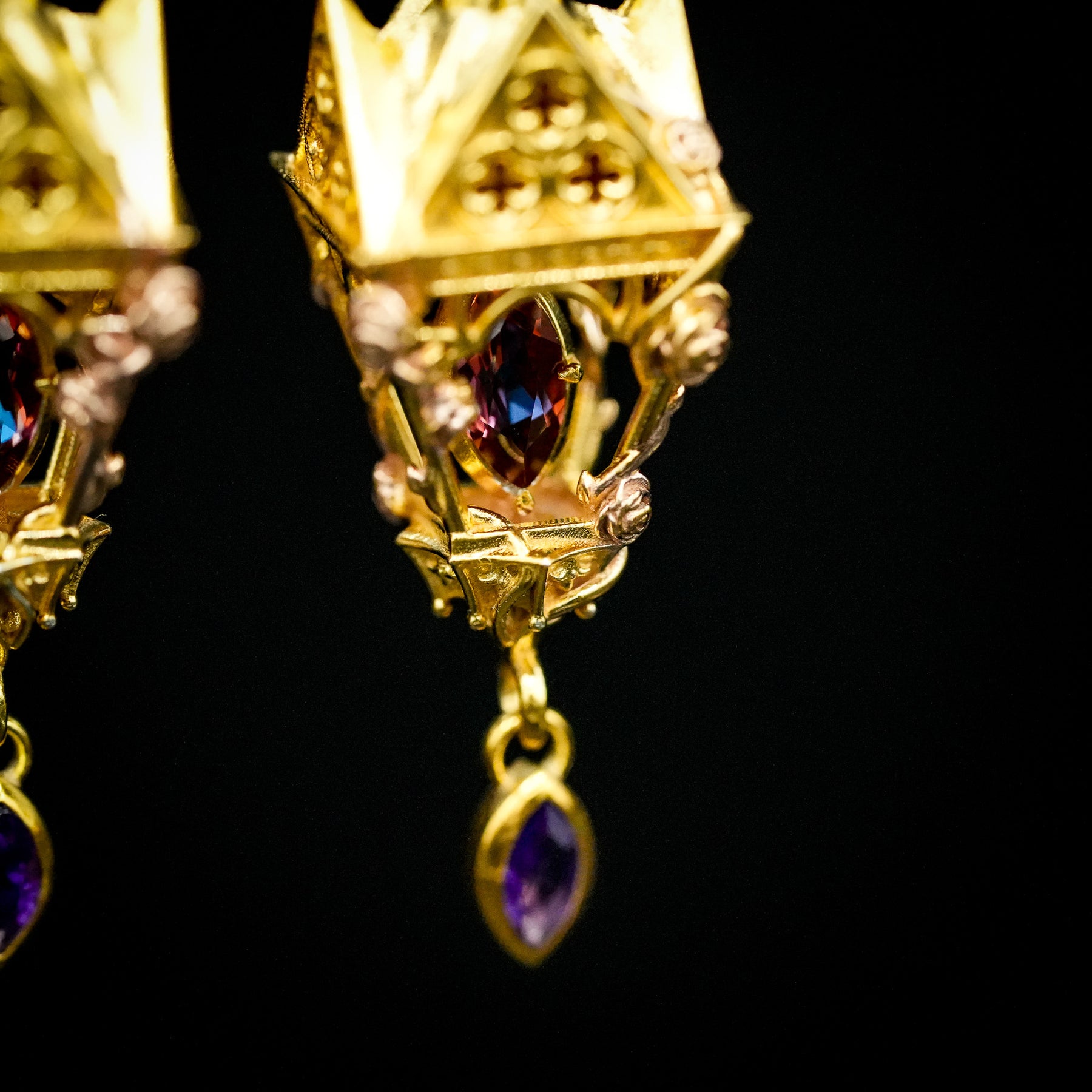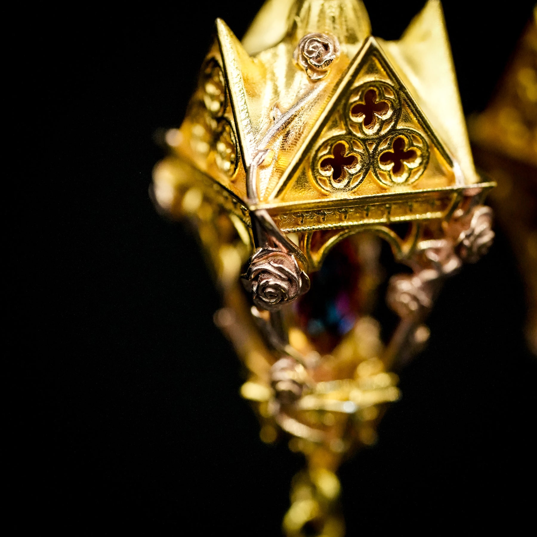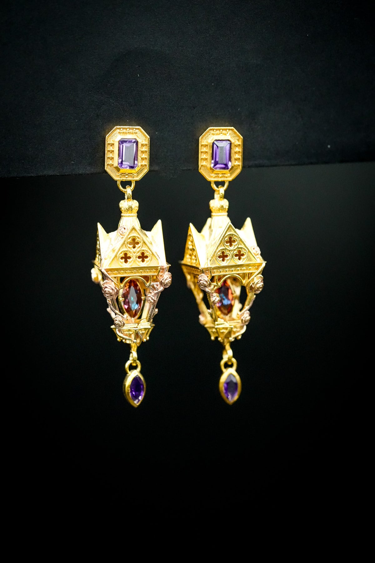 This listing secures the gemstone down payment for your one-of-a-kind Gothic Romantic lantern earrings, inspired by the dramatic beauty of Gothic architecture and the elegance of blooming rose vines. Crafted in luminous 925 sterling silver, your earrings will feature rich 14K yellow gold vermeil and delicate 14K rose gold roses and vines entwining the structure—bringing the story of eternal gardens and sacred cathedrals to life.